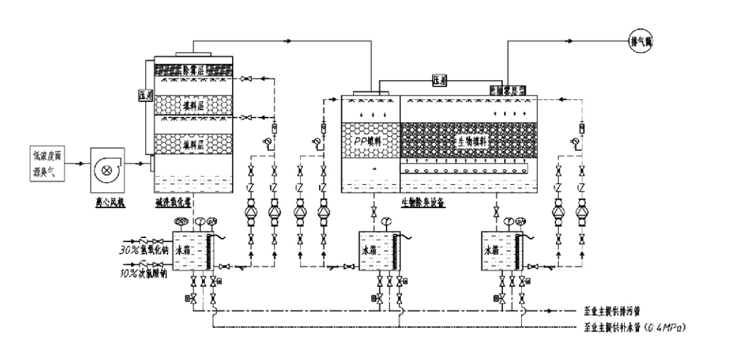Kombine biyolojik ovma ve filtrasyon koku giderme ünitesi üç biyolojik teknolojiyi birleştirir: biyolojik ovma, biyolojik damlatmalı filtrasyon ve biyolojik filtrasyon. Bu yeni kompozit biyolojik koku giderme cihazı, bu üç biyolojik tekniğin avantajlarının sentezlenmesiyle geliştirilmiştir. Kokulu gazlar, su veya konsantre kimyasal temizleme solüsyonları ile ön arıtmaya tabi tutuldukları giriş yoluyla yıkama bölgesine girerler. Bu fırçalama bölgesi, suda çözünebilen kimyasalların emilmesini, tozun uzaklaştırılmasını ve kokulu gazların nemlendirilmesini tamamlar. Giderilmeyen kötü kokulu gazlar daha sonra çok aşamalı biyofiltre yatağı filtreleme bölgesine geçer. Filtre katmanından geçerken kirleticiler gaz fazından biyofilm yüzeyine aktarılır: